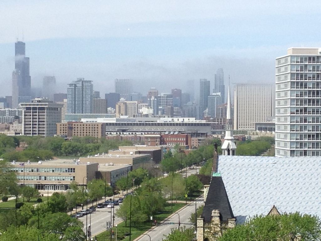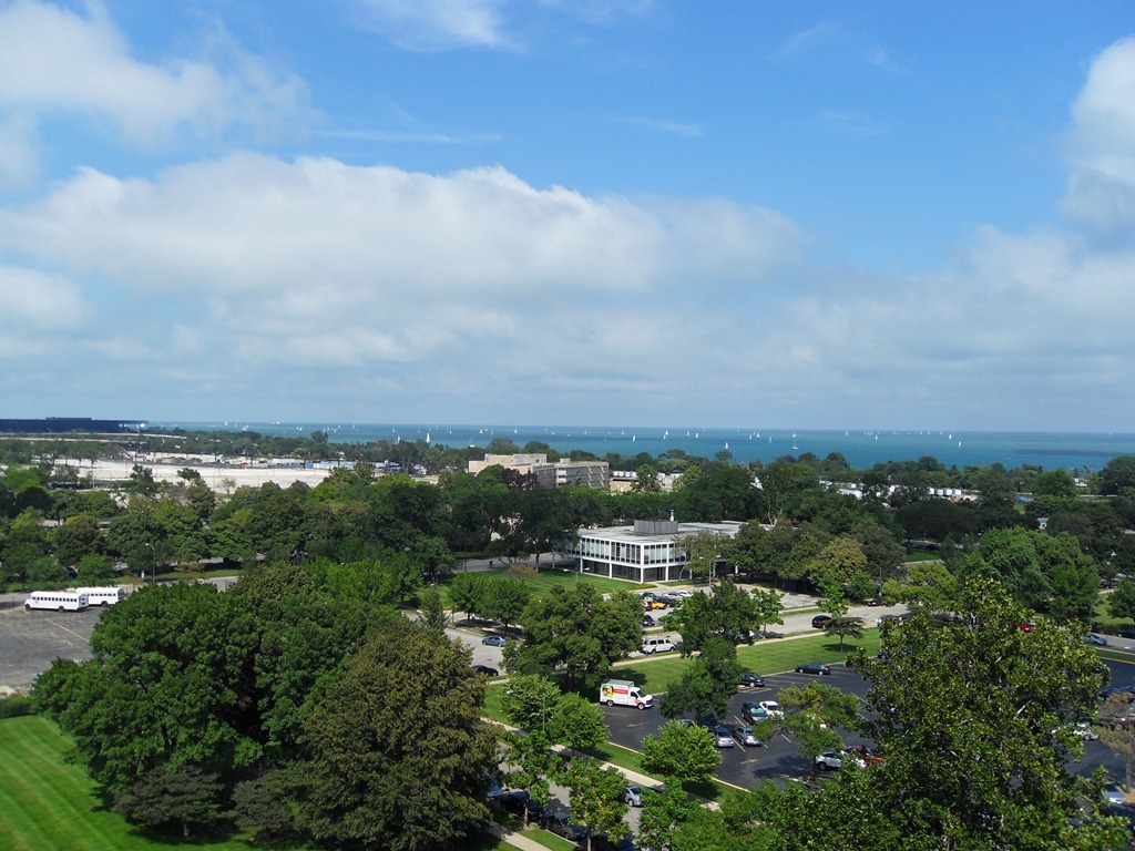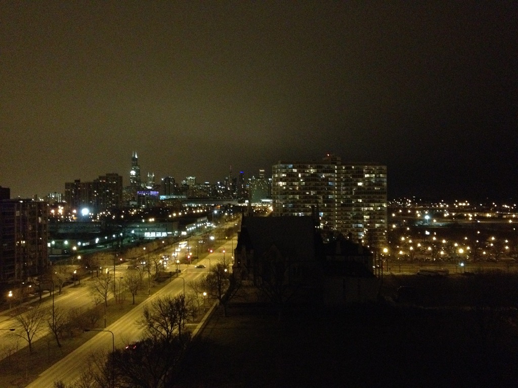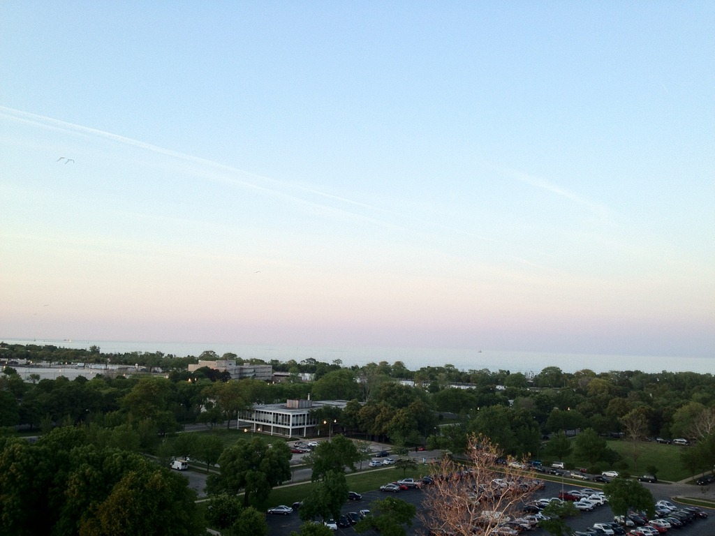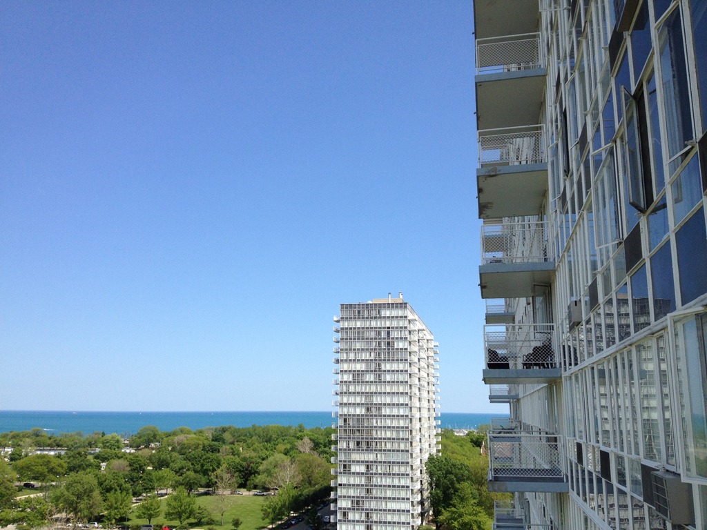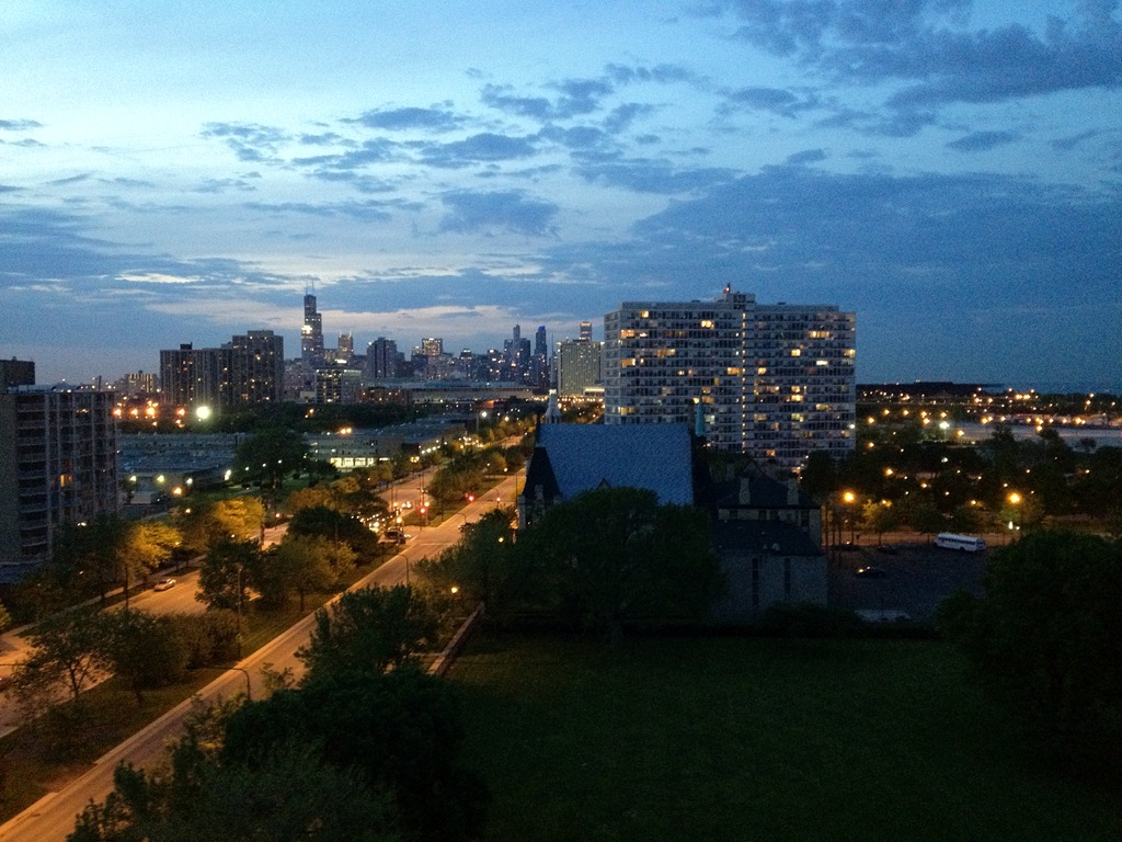 第二年的时候,我就搬到了现在住的地方。住在客厅里面虽然有很多弊端,但是最显著的好处就是有一个独占的阳台。这个小区有四幢楼,但是只有在这幢楼的这个方向的角落的阳台上才能同时看到密西根湖、 downtown 和西边的内陆地区。而且我住在12楼,视野足够开阔。这样的风景非常难得。