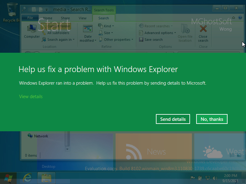 我没有遇到那个需要重启的问题,但 Windows Explorer 崩溃了一次,错误报告的对话框占了整个屏幕宽度。