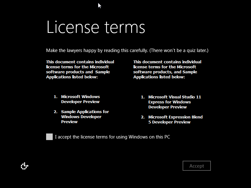 这个许可条例前面的说明很有喜感:“为了让律师们开心还是认真读读吧,不过放心等会儿没有测试。”在这一步的界面上看,整个设计彻底是 Metro UI ,很有 Windows Phone 的风格。