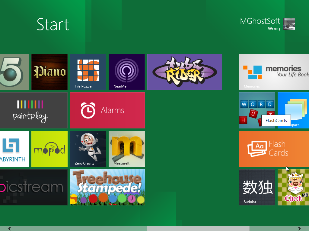 进去以后,第一个画面是这样的。事实上每次开机默认进的也都是这个 Start 面板。这个 Tiles 的界面像极了 Windows Phone ,连动画也是。