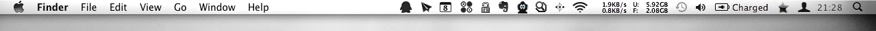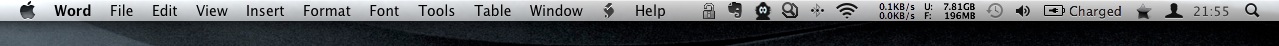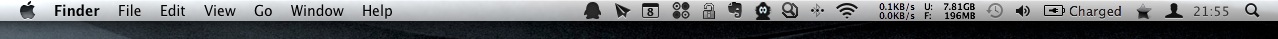 Mac OS X 的顶部常驻一行菜单栏,可以分成三部分:苹果图标,当前活动应用程序的名称和功能,以及附加图标。