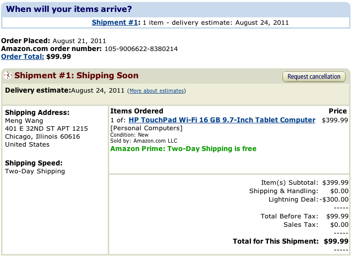 前天打算去看航空展,早上一起去的几个人来我们家吃饭,吃完之后等着出门。我就开了 Amazon 按惯例看了一下 Deals ,发现一个平板,只要99.99刀。99.99刀对一个平板而言足够便宜,不过现在做一个平板的成本本来也不高,所以如果是一个品质足够烂的平板,卖出这个价格也不奇怪。不过让我立刻发现异常的是,这个 Deal 是从399降到99的,而且点到商品的页面一看,所有的购买选项基本都在300以上,在 eBay 上搜了一下,也是300左右。这让我意识到这个是个很难得的 Deal 。跟刘主席讨论了一下,他看了一下就说要买。但是,我是没有买平板的计划的,又舍不得放掉这个 Deal ,思考了两三分钟,毅然决定买了。那个 Deal 的页面,我刚开始看的时候才只卖了 20% ,但是隔一分钟刷一次就涨不少,这在亚马逊的 Deal 里面是很罕见的。等我跟刘主席都付完款,已经全卖光了。