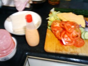 自己在家做的早午餐,新鲜、健康、成本低、不需要烹饪。首先说一下材料:除了芝士、火腿和酱汁,就是一些能生吃的蔬菜,具体选哪些就看个人口味了。