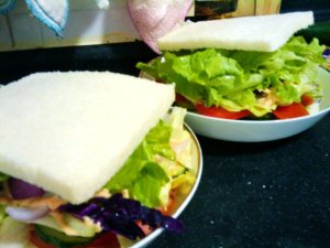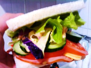 其实,想要不让里面的东西撒出来还真是个技术活……最后总结一下:吃的时候才深刻地理解到为什么老外用方面包做三文治之后要沿对角切开——把这么厚的面包的度数为 pi / 2 的一个角放到嘴里真是很困难的事情。不过口感和味道还真好,就是芝士放得有点多了,吃到后面有点腻。 -